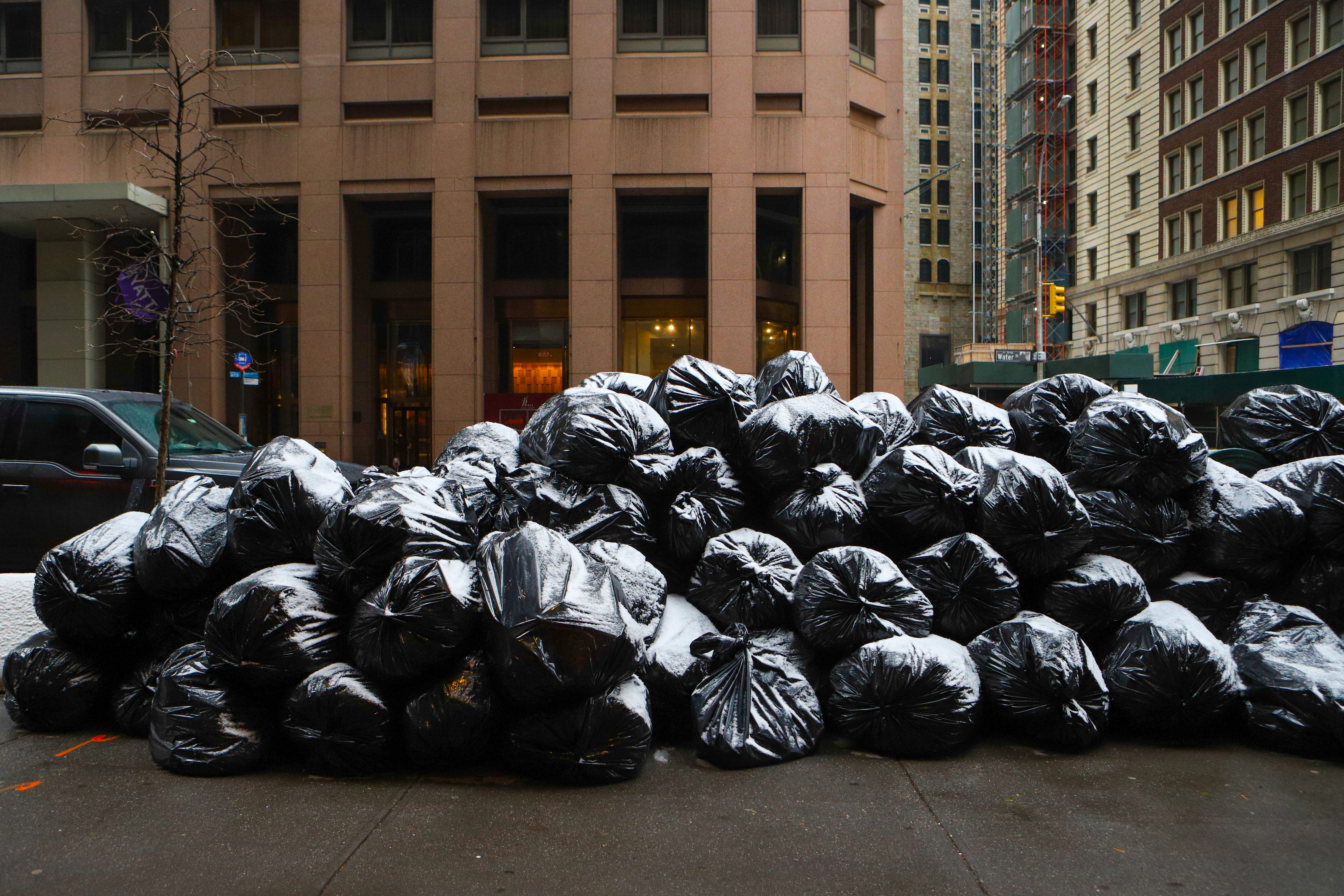 My focus drifts to the left and I notice a small hill of black garbage bags. Big ones. Full bulging. At least fifty of them.