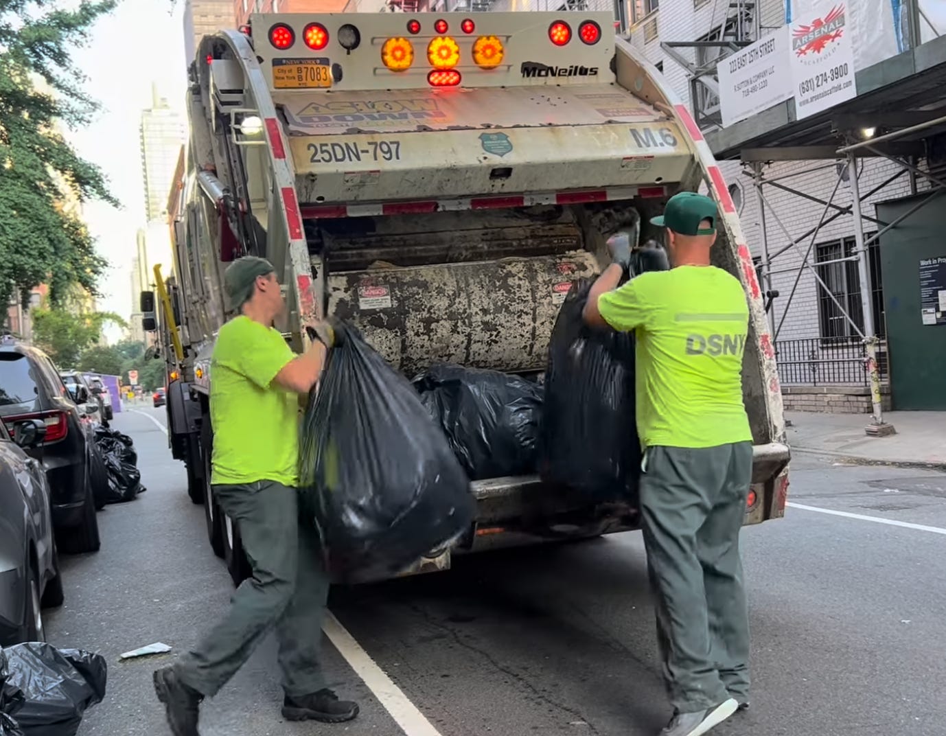 A moment later, a garbage trucks pulls up in front of this pile of trash.